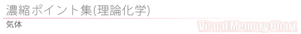 | ■気体の語源 ・気体=ガスの語源はギリシャ語のchaos(カオス)=混沌。 ■気体の体積 ・気体分子が封入されている容器(入れもの)の大きさ。 ■気体の圧力 ・気体分子が容器の壁に衝突して、それによって生じる単位面積あたりの力の大きさ。 ■温度 ・分子の熱運動(運動エネルギー)に比例する値。 ■圧力と体積の関係のイメージ ・空気入れで自転車に空気を入れる。⇒空気を入れれば入れるほど手に返ってくる圧力が強くなる。つまりPV=一定。 ■温度と体積のイメージ ・膨らませていた風船をしばらく冷蔵庫に入れておくと、縮んでくる。⇒空気が冷やされ体積が小さくなる。 つまりV/T=一定 ■理想気体の混合気体 ・ある気体Aが入っている容器に、温度、容積一定で気体Bを入れた。A、B気体の圧力はお互い影響せず、それぞれの圧力を示す。 ■ボイルの法則 ・「一定温度において、一定量の気体の体積V、圧力Pに比例する。」この関係をボイルの法則という。 ■シャルルの法則 ・シャルル(1787年)は「一定圧力のもとで、一定量の気体の体積は、温度が1℃上昇するごとに0℃のときの体積の 1/273ずつ増加 する。」ことを発見した。 ・この関係をはじめて発見したのはシャルルだが、温度1℃あたりの気体の体積膨張率を正確に測定したのは、フランスのゲーリュサック〔1801年)。 ☆「圧力一定のとき、一定量の気体の体積Vは絶対温度Tに比例する。」この関係をシャルルの法則という。 ■絶対温度 ・−273℃を0度とし、セルシウス温度と同じ間隔で目盛った温度を絶対温度といい、0Kをとくに 絶対零度 という。これ以下の温度は存在しない。 ☆0(K)は正確には−273.15℃。 ■ボイル・シャルルの法則の注意点 ・式中で単位が統一されていれば、体積の単位は(L)、(mL)のとちらも使用できるが、温度は必ず絶対温度(K)を使用する。(℃)ではダメ。 ■ボイル・シャルルの法則とグラフ ・一定量の気体についてx軸を横軸に、y軸を縦軸にとる。1atmのもとで、温度x℃で変化させたときの体積yLの変化のグラフは、セルシウス温度のため、原点を通らない右上がり直線のグラフになることに注意。絶対温度のときは原点を通る。 ■ドルトンの分圧の法則 @混合気体の 全圧 は、 各成分気体の分圧の和 に等しい。 Aまた各成分気体の分圧は、それぞれの気体の分子数に比例するので、混合気体中の各成分気体の分圧の比は、各成分気体の物質量の比に等しい。 ■水上置換で捕集した気体の圧力 ・内圧は、捕集した気体の圧力と水蒸気の圧力の和。 ■体積可変のシリンダー ・大気圧(外圧)=シリンダーの内圧(混合気体の圧力)。 ■蒸気圧 ・飽和とは別名最大蒸気圧。越えたら液体になってしまうということ。 ■飽和蒸気圧になっている時 ・飽和蒸気圧になっている時は2つある。 @液体があるとき。 Aすべて蒸発した瞬間または液化しはじめる瞬間。 ■飽和蒸気圧計算のポイント @すべて気体になっていると仮定して、気体の圧力を状態方程式から求める。 A仮定した圧力と飽和蒸気圧の値と比較する。 (@)飽和蒸気圧の方が大きい場合→すべて気体の状態→仮定した圧力になる。 (A)飽和蒸気圧の方が小さい場合→気液平衡状態→飽和蒸気圧が気体の圧力。 ■飽和蒸気圧と沸騰 ・外圧(大気圧)=飽和蒸気圧を満たす温度が沸点。 ・大気圧が下がると、低い飽和蒸気圧になる。→低い温度で沸騰。 ■理想気体 @理想気体とは 分子間力 と 分子自身の大きさ(体積) を無視した気体。 A実在気体は、分子の体積や分子間力の影響により、状態方程式には厳密には従わない。しかし、 常温 、 常圧 付近ではよく成り立つ。 B 高温低圧 ほど理想気体に近づく。 ☆ポイント ・理想気体の分子は体積は無視するが質量はある。 ・理想気体はいかなる条件でも凝縮、凝固はしない。 ・ヘリウムは最も軽い単原子分子であるため最も理想気体に近い挙動を示す。 |