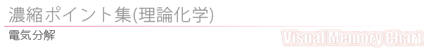 | ■電気分解 ・電解質の水溶液や融解液に電極を入れ、外部から電流を流して化学変化を起こさせること。 ■電気分解と電池 ・電池とは、電極自身による酸化還元を利用して電流を取り出す装置。 ・電気分解とは、外部から加えられた電気エネルギーによって、強制的に化学変化を起こさせること。 ■水溶液の電気分解と電気伝導性 ・ 水は電気をほとんど通さない ので、酸化・還元されにくい電解質(硫酸や水酸化ナトリウム)を加えて電気を通しやすくする。 ・弱酸である酢酸は、強酸の塩酸より電離度が小さい。よって、酢酸水溶液中のイオン濃度が小さいため、塩酸より電気を通しにくい。 ■陰極・陽極 ・直流電源の負極につないだ電極を陰極 、 正極につないだ電極を陽極と言う。 ■電子の流れ ・電子は陰極に流れ(電子を受け取るので還元反応)、陽極から吸い取られる。(電子を放出するので酸化反応)。 ■電気分解の難易 ・ 金属イオンではイオン化傾向の大小 、 非金属では電気陰性度の大小が関係する。 ■陰極での反応 ・最も還元されやすい陽イオン、つまり、イオン化傾向の小さい金属イオンから還元される。 ■陽極での反応 ・電子を奪われる酸化反応が起こるが、最も酸化されやすい陰イオン、つまり構造が簡単な単原子イオンから酸化される。 ☆例……@ハロゲン化物イオンがある場合はハロゲンの単体が生成。 A硫酸イオン、硝酸イオン、リン酸イオンなどの多原子イオンがある場合には水分子自身が酸化されて酸素が発生する。 ・2H2O→O2 ↑+4H+ +4e− ■ハロゲン化物イオン ・複数のハロゲン化物イオンがある場合、電気陰性度の大きいものほど電子を引きつける力が強く、電子を放出しにくい。 ■融解塩電解 ・Na+、Mg2+、Al3+ などイオン化傾向の大きい金属イオンは、水溶液の電気分解では還元されない。よって、これらの単体は、その塩の融解液を 電気分解(融解塩電解) することでしか得られない。 ■主な水溶液の電気分解 @塩化銅(U)水溶液 ・陰極:Cu2++2e− →Cu ・陽極:2Cl− →Cl2 +2e− A水酸化ナトリウム水溶液 ・陰極:2H2O+2e− →H2+2OH− ・陽極:4OH− →2H2O+O2 +4e− ☆上記式より結局、水が電気分解されている。 B塩化ナトリウム水溶液 ・陰極:2H2O+2e− →H2 +2OH− ・陽極:2Cl − →Cl2 +2e− ☆陰極側の溶液ではOH− の濃度が大きくなり、溶液中の電荷のバランスを保つように、陽イオンであるNa+ が 陽極側から移動してくる。よって液中にはNaOHが生成していて、電解後の陰極液を濃縮するとNaOHの結晶を 製造することができる。 C硫酸銅(U)水溶液 ・陰極:Cu2+ +2e− →Cu ・陽極:2H2O→O2 +4H+4e− ■水の電気分解 ○陰極: ・水溶液が酸性の場合:2H+ +2e− →H2 ・中性・塩基性の場合:2H2O+2− →H2 +2OH− ○陽極: ・水溶液が酸性の場合:2H2O→O2 +4H+4e− ・中性・塩基性の場合:4OH− →O2 +2H2O+4e− |